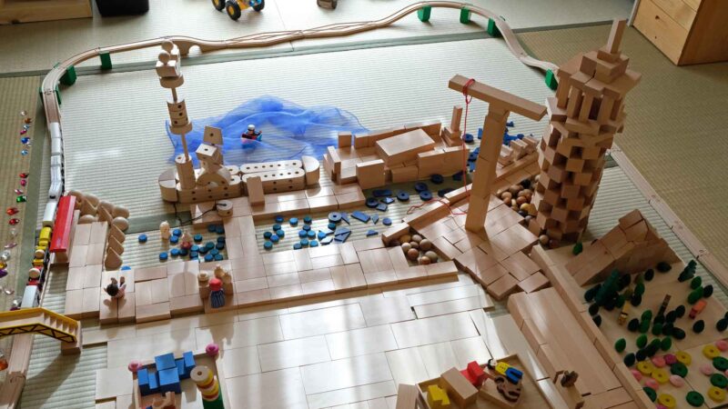 ある休日に、積み木やゲーテのくみ木を使って、港を作って親子で遊びました。