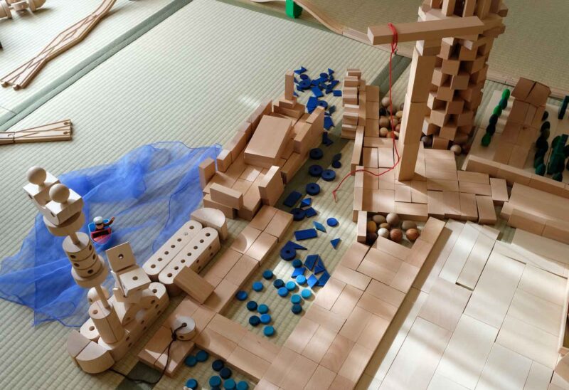 子どもはゲーテのくみ木のジョイント棒を外すのが難しいときもありますが、ひとりでどんどん組み立てています。完成したら、持ち運べるよう連結が甘い箇所は親が押しています。