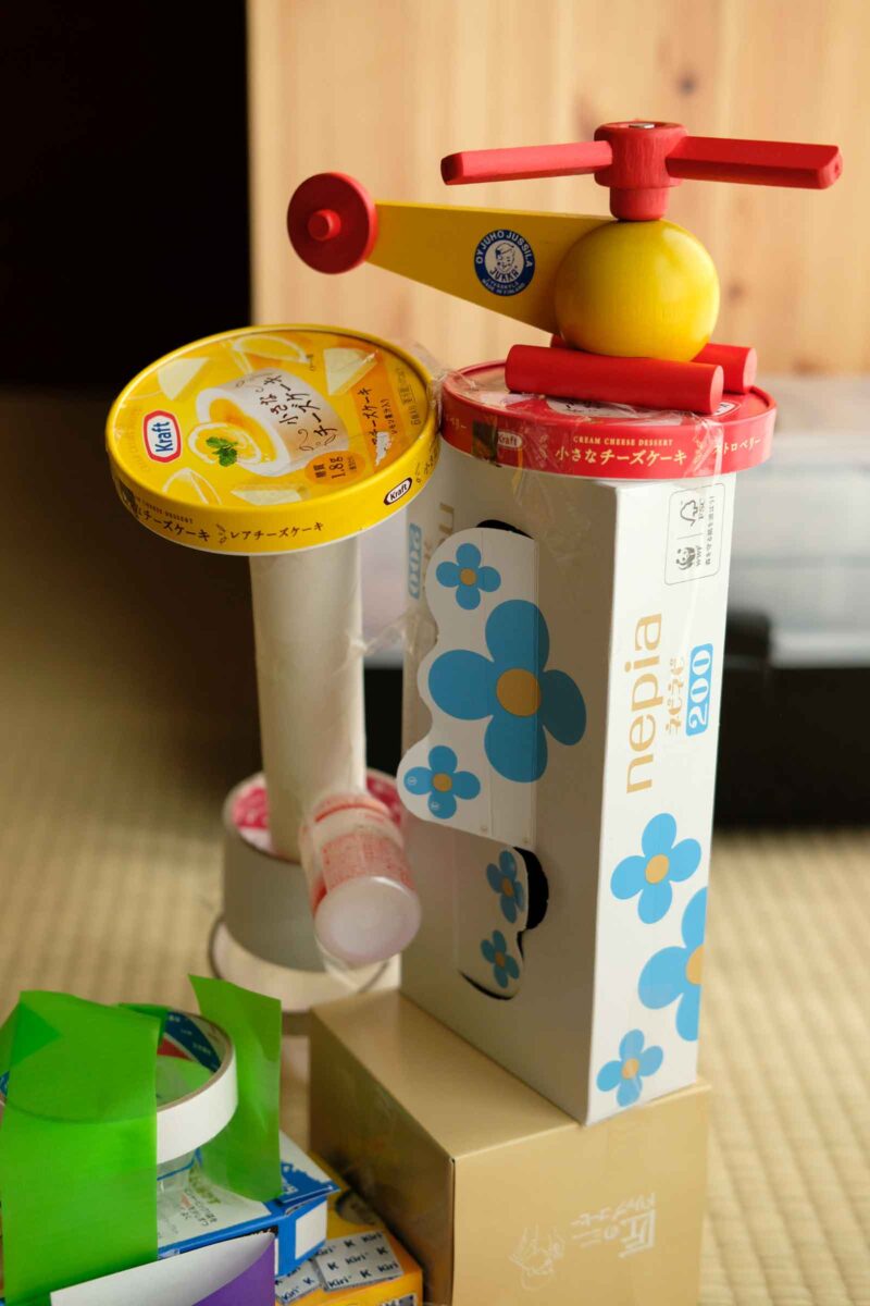 ある日、親が「ヘリポートのあるビルに行く」という話をすると、子どもがいらない箱をセロテープでとめて、「ヘリポートのあるビル」を作りました。