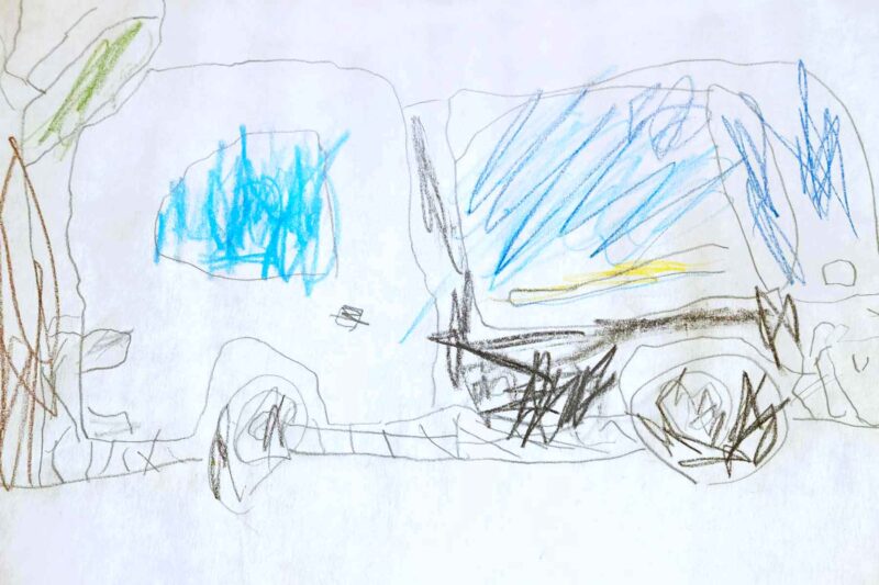 次の絵が私の絵を見ながら描いた「ゴミ収集車」(3歳8ヶ月)です。