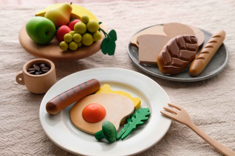 近年、エドインターなど国内のメーカーでは、低年齢でも遊べるように、おままごとの食材が昔より大きくなっている印象です。