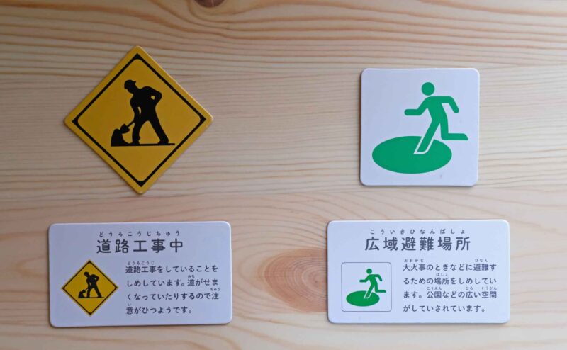 子どもは標識をまだ完璧に覚えておらず、「道路工事中」の標識を「落とし穴!」と読み上げて、夫が間違えて「広域避難場所」の札を取ったりすることもありますが、それもまた楽しいです。