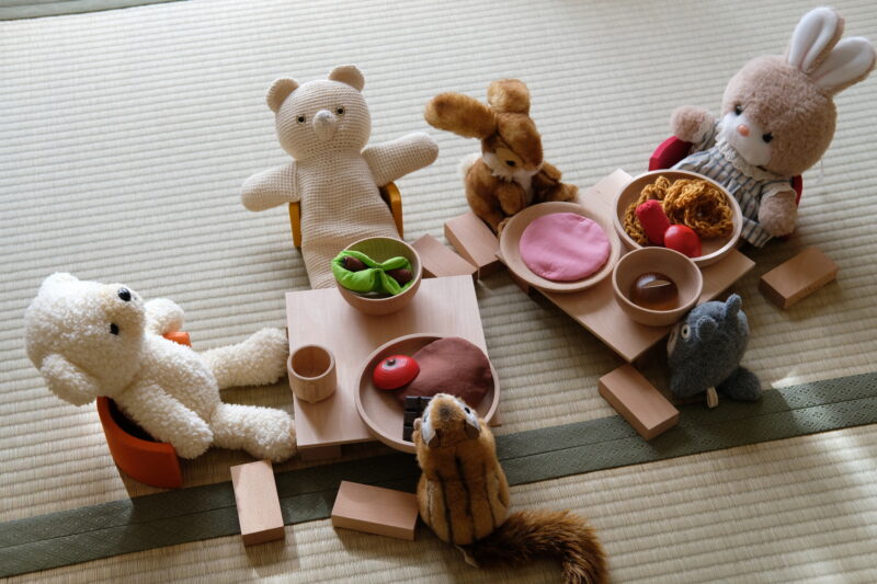 ぬいぐるみのウサギやリスにご飯を作ってあげたり、ケーキ屋さんやレストランを開いたりもします。