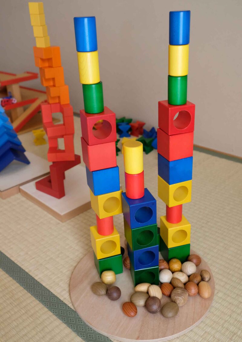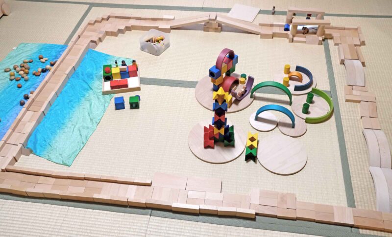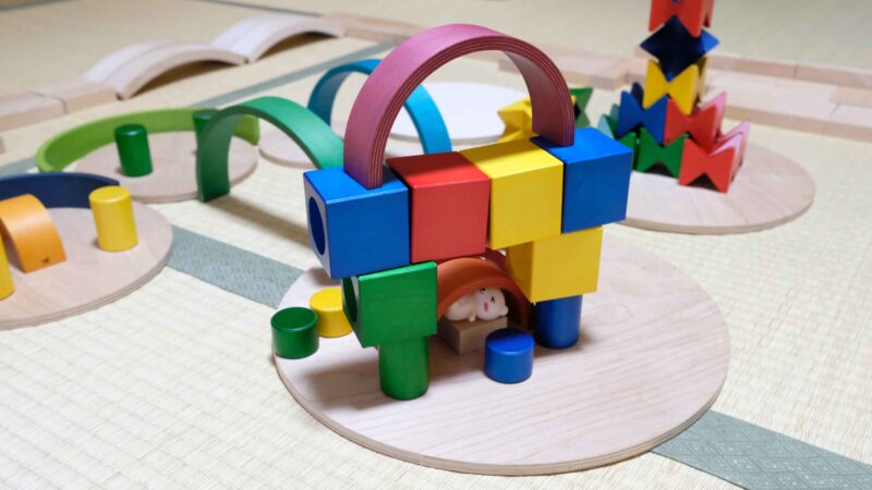 そこで「自由に積んでいいんだよ」と思えるアプローチが必要だと考え、白木の積み木で何かを作った後に、ネフの積み木も出して何かを作るというふうにしてみました。