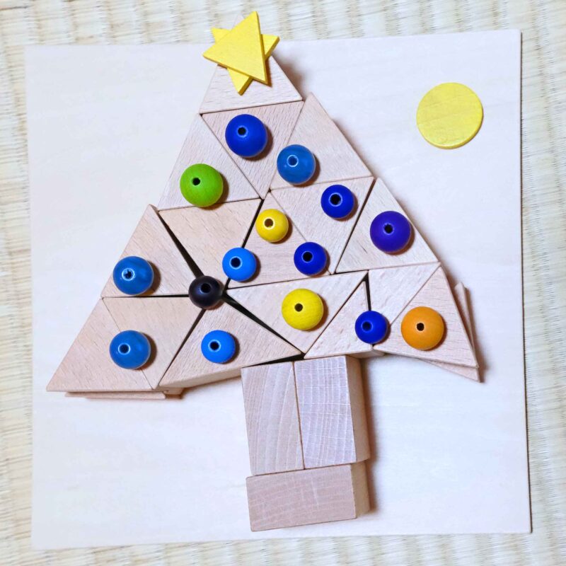 三角をたくさん使ってクリスマスツリーを作っていました。飾りは木製ビーズです。星と月はジーナモザイクです。