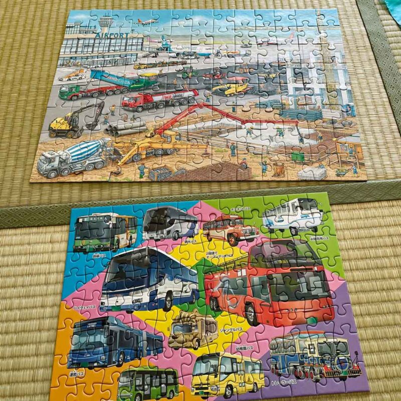 空港のパズル(100ピース)をひとりで完成させたあと、くもんのバスのパズル(96ピース)も完成させていました。