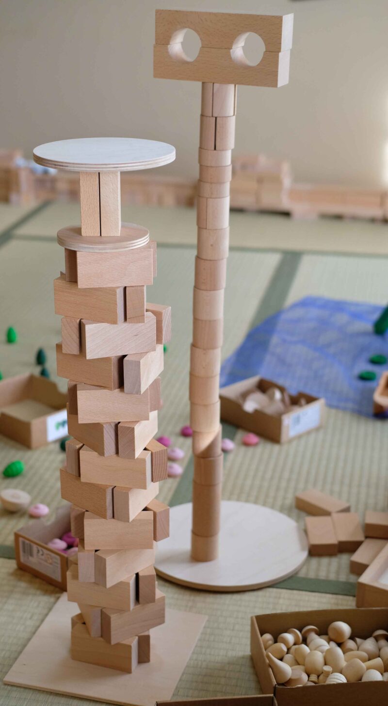 いろいろな円柱が積み重ねられ、一番上に重い積み木を載せても崩れないので、小さな大工さんの積み木は精度がいいんだなぁと感心しました。